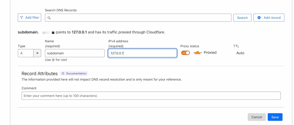 If you are using Cloudflare, you need to add an A/AAAA record (for IPv4 and IPv6 respectively) to your DNS records. Log in to your Cloudflare account here and select the desired domain. On the left side of the page, click on DNS and then click on Records. Click on Create record. Set the Type to A and the Name to @.If you want to use subdomains, enter the subdomain name (e.g.